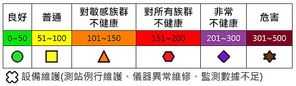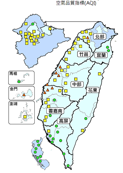 台灣在1975年制定《空氣汙染防治法》,管制懸浮微粒PM10、臭氧、氮氧化物、硫氧化物、一氧化碳等五個汙染物,並以「空氣汙染指標PSI」來呈現空氣品質。以目前行政院空氣品質觀測網的結果看來 (http://taqm.epa.gov.tw/taqm/tw/default.aspx),不健康的區域有:金門、崙背、麥寮、彰化。